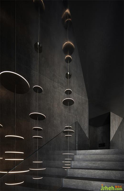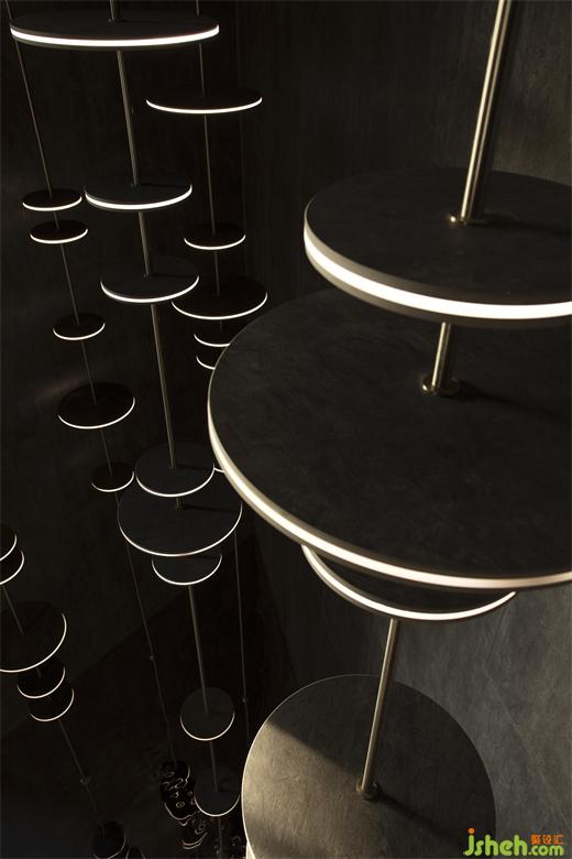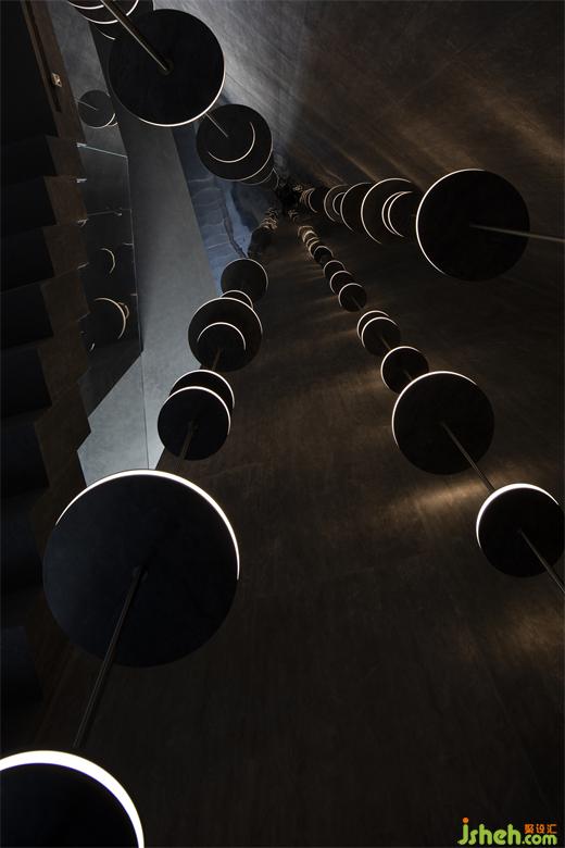 如:展厅一角的砖贴面的圆盘灯,它们以散落的独立个体集结成章,有序串联成流动的圆盘灯束,由挑空的穹顶倾泻而下,潋滟了整个原生态的空间氛围。
