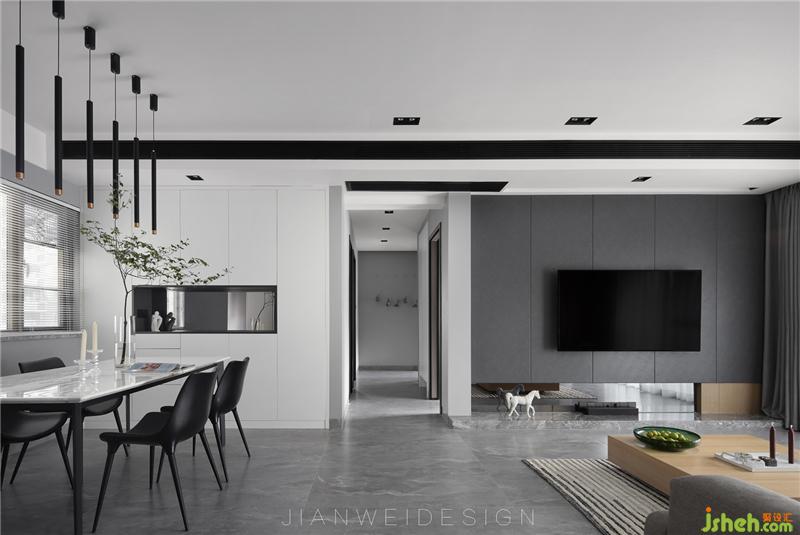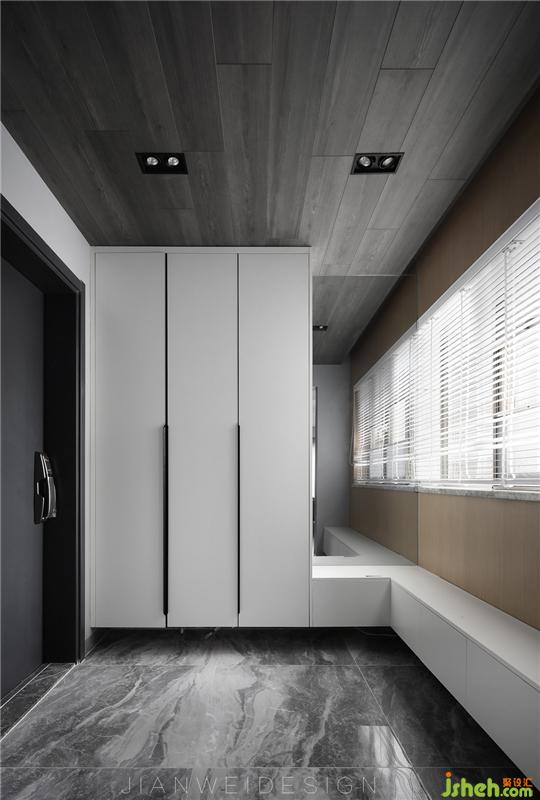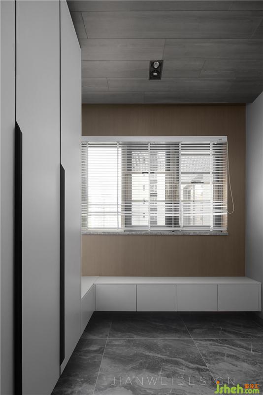 黑色的水墨大理石地板,洁白的定制收纳鞋柜与换鞋凳,大面积的墙面穿衣镜,透亮的百叶窗让整个空间的光照变得富足。简约,经典。黑白灰的材质界定着空间领域,营造着视觉和触觉的感官差异,仿佛置身于钢琴的黑白琴键之中,每一片都是奏响简约美的琴键。