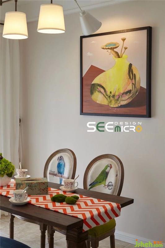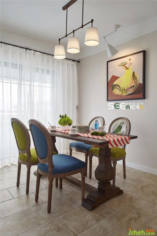 餐厅设于落地窗边,保证了空间的采光与通透性。美式实木长餐桌给人以稳重敦实之感,巧妙的是,绿、蓝两色餐椅的选择恰到好处地将焦点转移,半透明的窗纱则以其轻盈质感与餐桌形成对比,营造出一个清新舒适的用餐环境。墙上一幅暖色系艺术画“如意”与简约的铁艺美式吊灯则将空间视线纵向拉升。装修设计