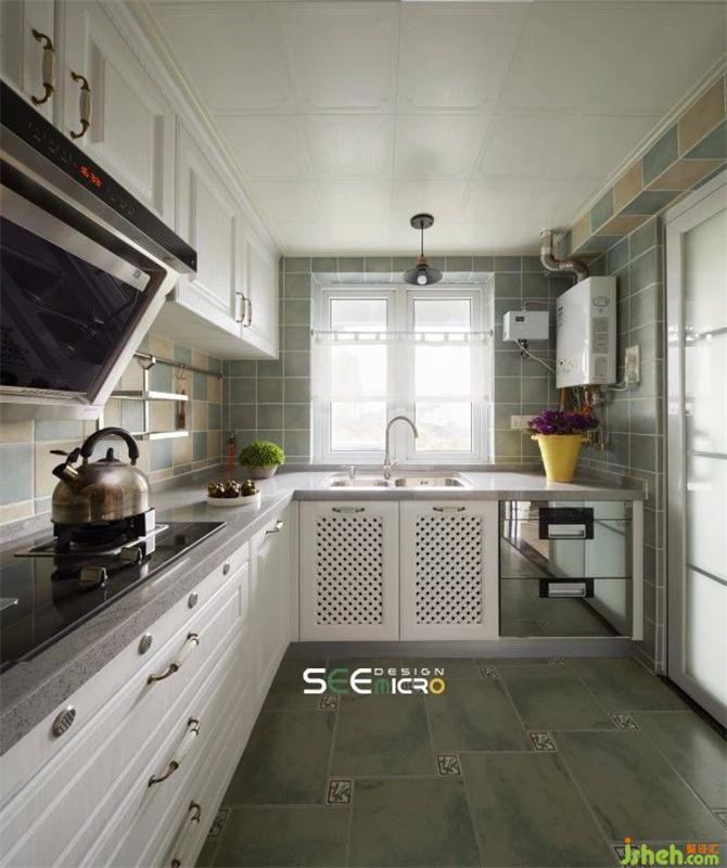 厨房以纯白、墨绿二色奠定基调,整体空间一目了然,给人以洁净的清爽感。U型橱柜的选择能够在两面相连的墙之间划分工作区域,每个作业区都留有操作台面,大大减少了厨房惯有的拥挤感。复古瓷砖的错落拼贴为厨房平添了一种文艺气息,实际上深色系的瓷砖更易于日常打理。装修设计
