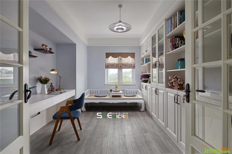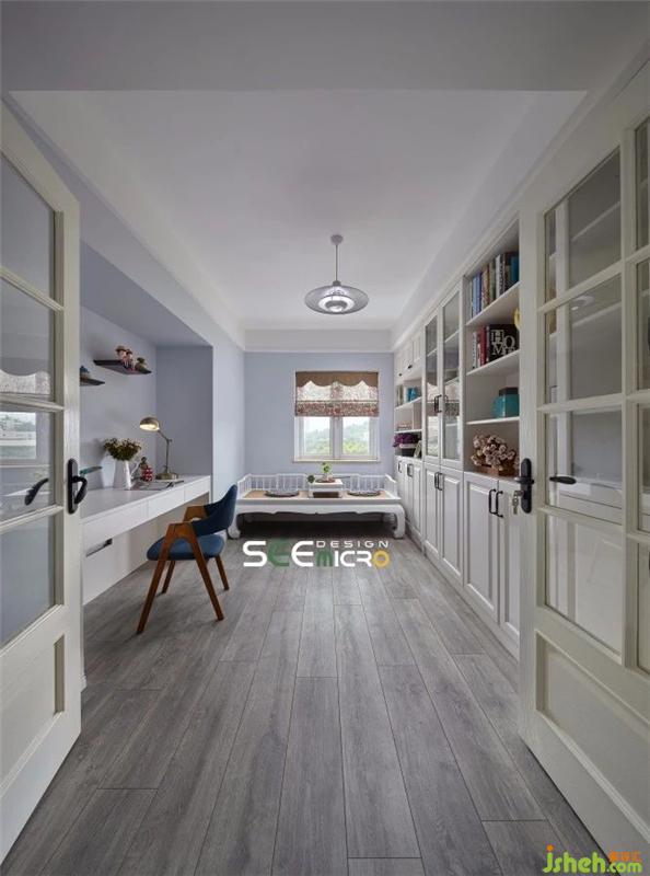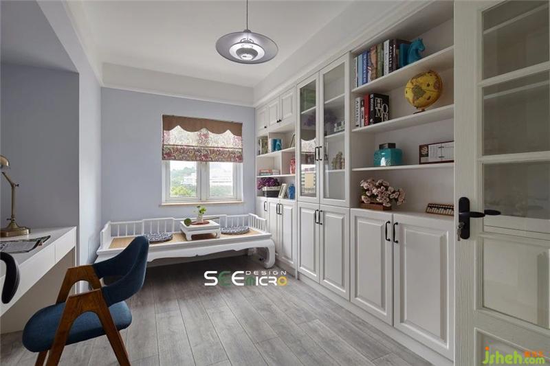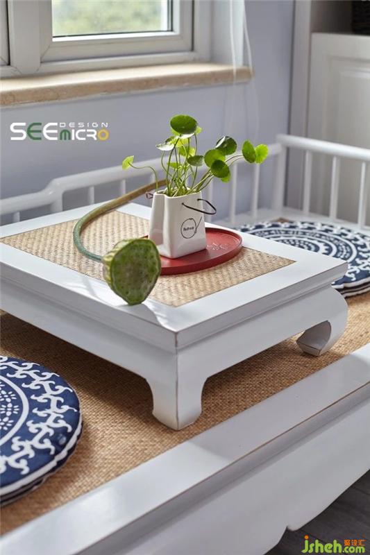 沿承其他空间区域的清新色调,设计师以整面的素白书柜与浅蓝色的墙壁将整个书房处理得更加通透。长条形木质地板将视觉空间往里延伸,尽头的罗汉床上以一个莲蓬、两席蒲团营造出简约而不简单的几许禅意,半掩的窗则最大限度的为书房引进了自然光。