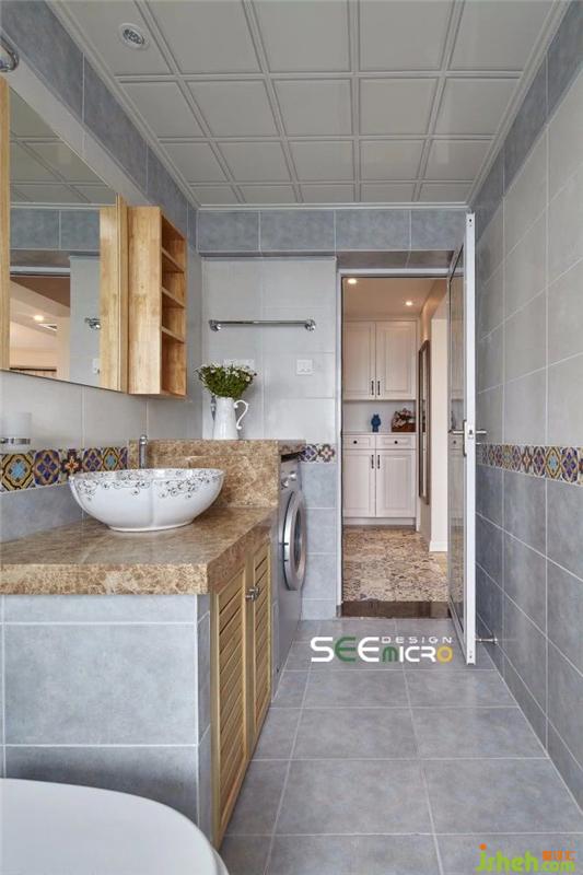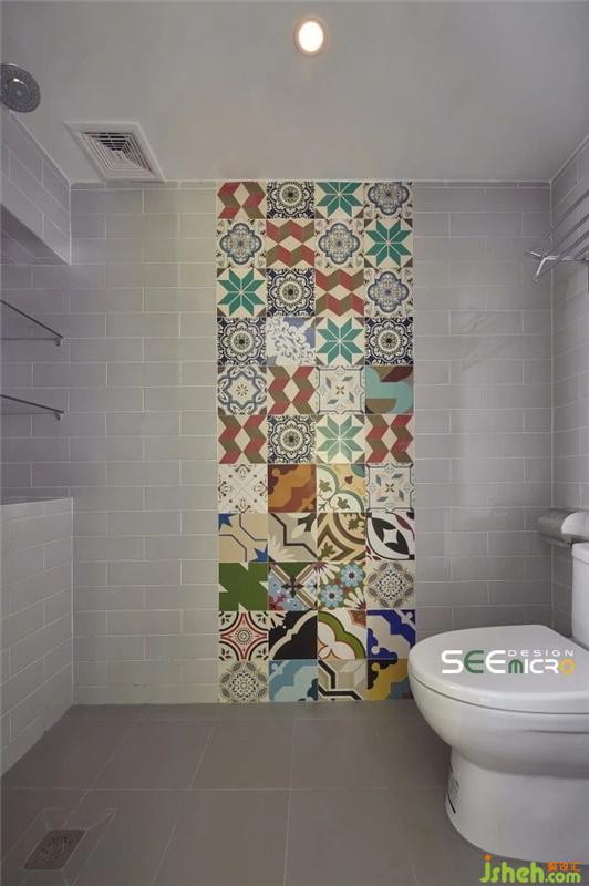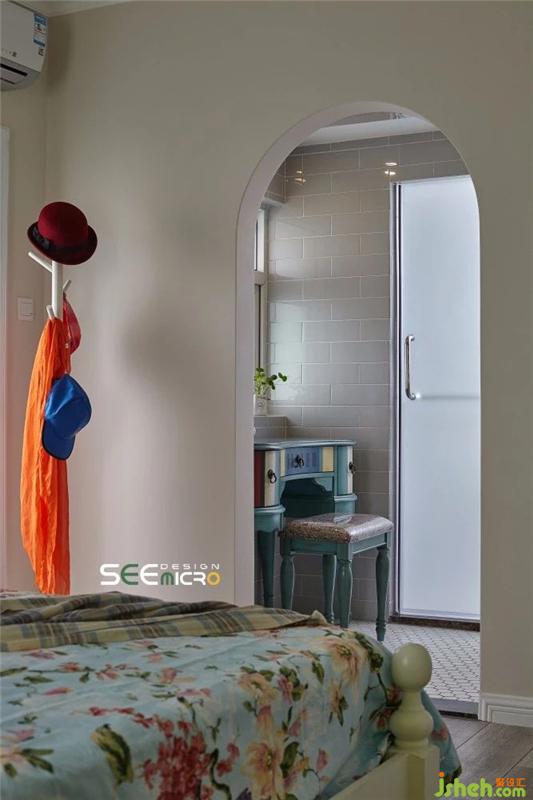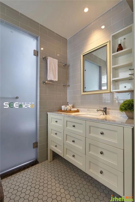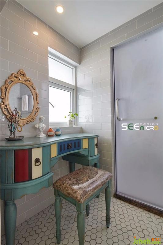 从主卧的一扇拱门进去便是主卫所在之处,主卫做了干湿分区,外面是美式风格饱满的梳妆台与洗漱区,里面是冲凉区,中间以一扇磨砂玻璃门做隔断。主卫干区一改其他区域的大块地砖,选用六边形马赛克瓷砖使整个空间美感升级;推开磨砂玻璃门进入湿区,则可见到一面不规则铺贴的花砖,艺术感十足。装修设计