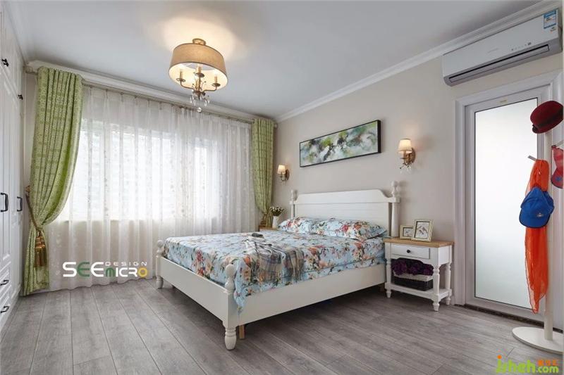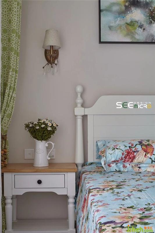 由于女主人喜欢小清新风格,因此主卧的整体设计风格偏文艺——素雅的嵌入式衣柜、简约舒适的实木大床、寓意美好的印花床品、线条流畅的淡绿色落地窗帘与墙上一幅耐人寻味的抽象画,整个空间以舒展而优美的线条回归初心的美好。装修设计