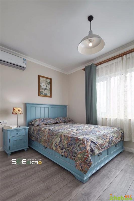 主人母亲钟情蓝色,特意选了一张湛蓝的美式大床,与边上床头柜为同一色系,搭上一袭民族风印花床单,自成一景。带抽屉的大床不仅美观,且能够满足储物需求,夏日到了便可将棉被等物件收纳起来。床头柜上的花色灯罩与墙上的壁画主体相互呼应,无意间便点缀了视觉空间。