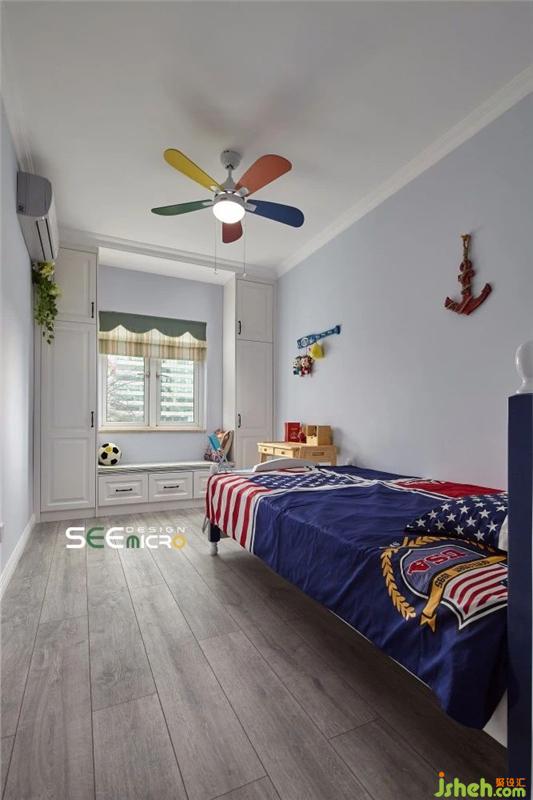 墙壁粉刷成淡蓝色,素净却又不失童趣。整个空间的美式风格集中体现在儿童床、床品与墙饰上,海军蓝与落日红碰撞出鲜明的风格特点。窗两边定制了衣柜,中间特意增加了一个飘窗卡座,满足储物功能的同时,又打造了孩子的另一个玩耍区。