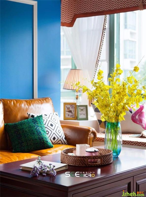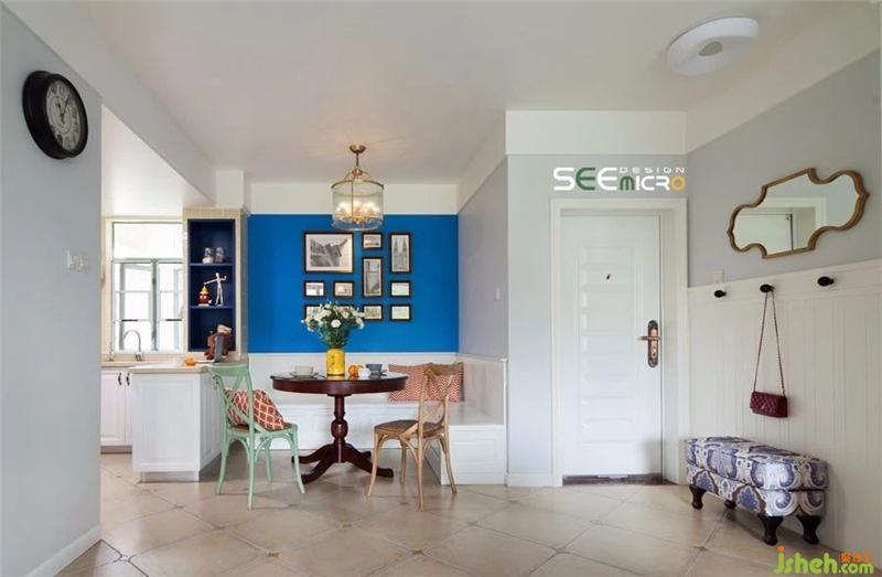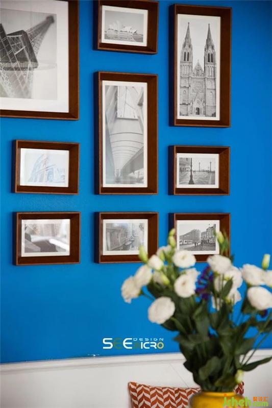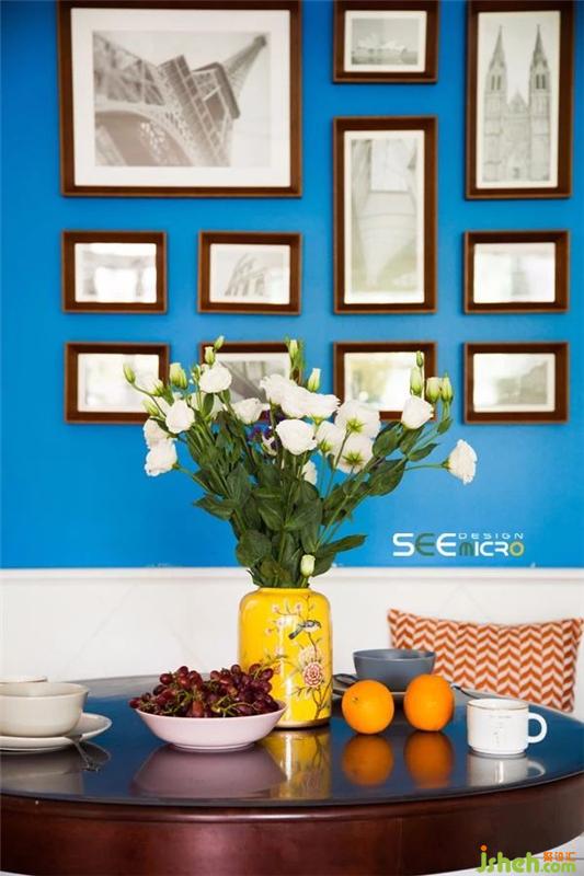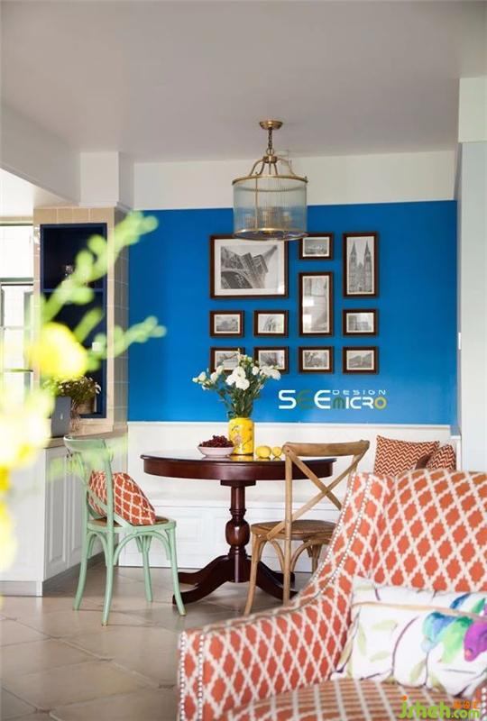 客餐厅空间以通透式设计的手法形成空间连贯性,并保证了餐厅的采光。蓝色背景墙与客厅呼应,建筑挂画又给空间注入了一抹亟待探寻的故事感。装修设计