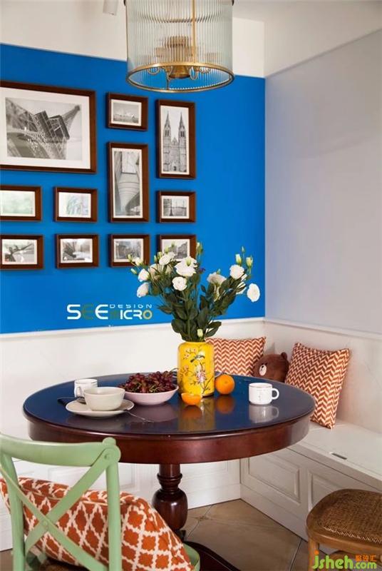 餐厅的方形小空间利用L型卡座解决餐桌难放的问题,更显温馨惬意,还成了小朋友最爱的区域。