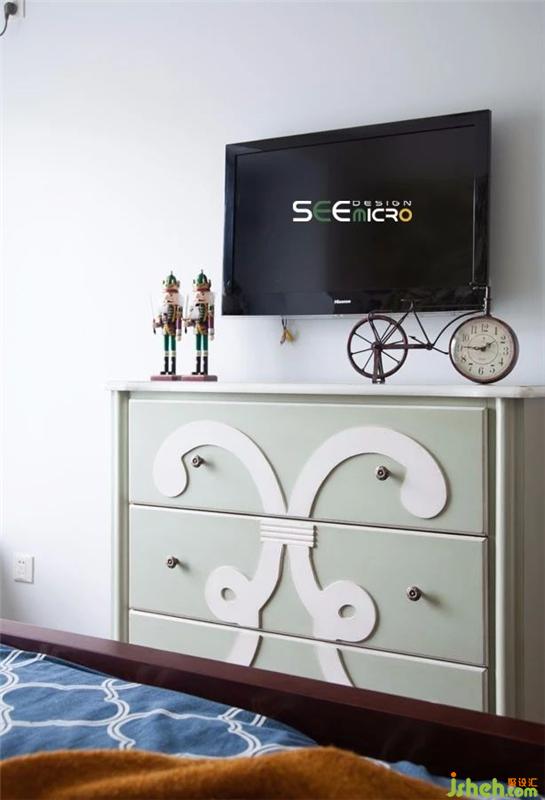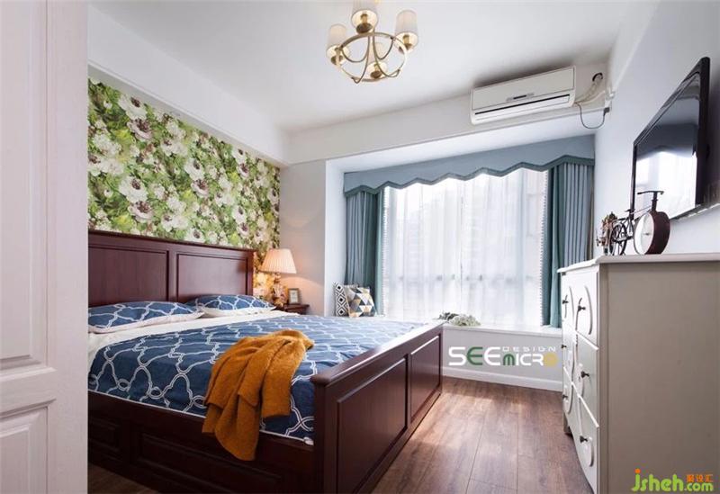 主卧给人以素雅、自然之感——生态的原木地板、生气盎然的花卉墙纸与舒适柔软的印花床品以大地色、绿色、蓝色构成了空间主基调。装修设计