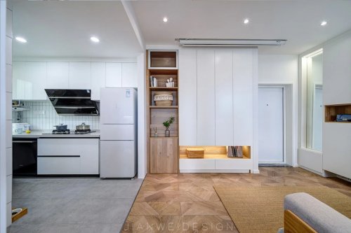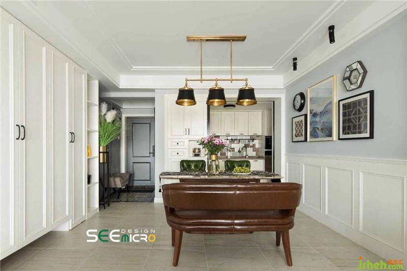 高级灰实木背景墙线条纤细却有力,鞋柜储物结合电视墙整面设计,足够安放进出门的鞋履;落地镜的作用则发挥到极致,延展空间的同时,镜面的反射,借用光学原理让处于中部的餐厅亮堂起来,让视线所及之处更通透,心情也随之变得开阔明朗起来。