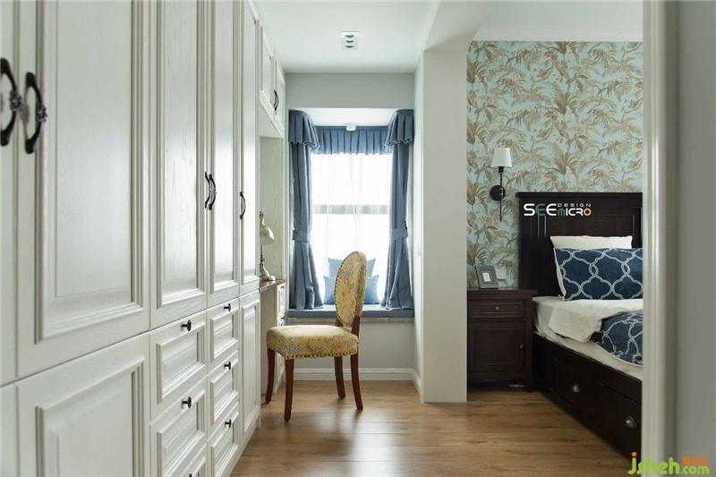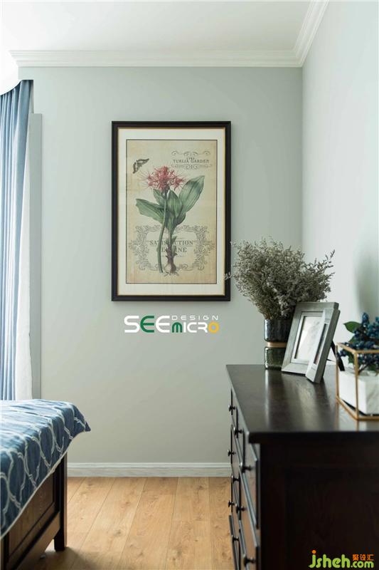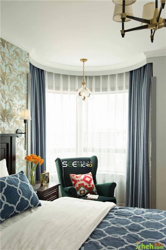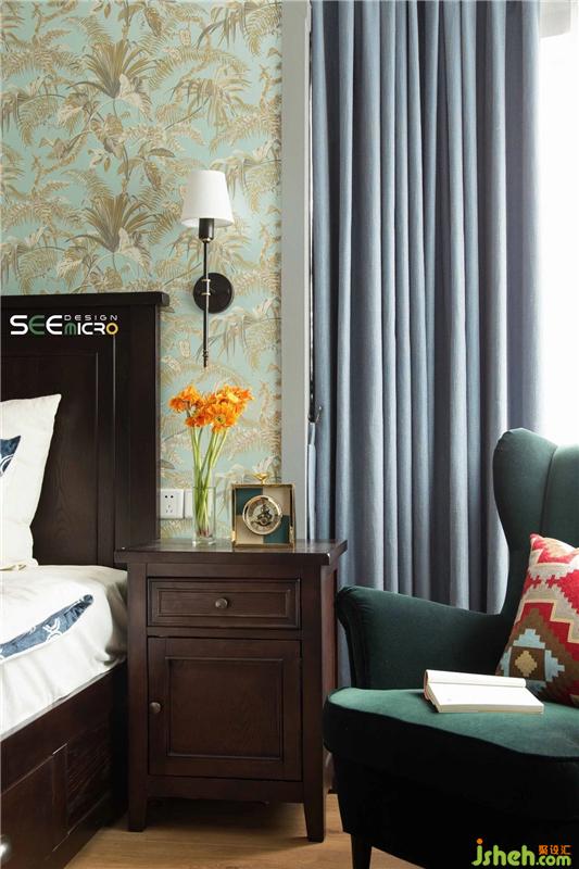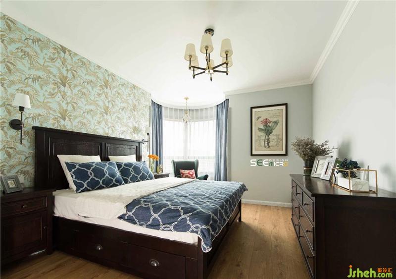 主卧床头背景墙搭配古典美式大床,内敛安静,饱含韵味,古典与优雅两相宜,和谐的色彩搭配营造出温馨恬静的舒适环境。