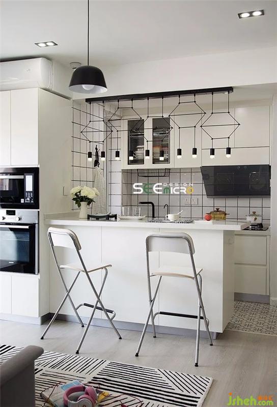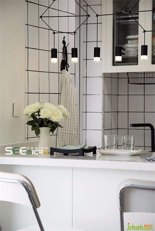 吧台上的小吊灯,不仅线条感极强,极具审美性,它本身的镂空设计还形成外界空间和厨房功能区之间隔而不断的效果。