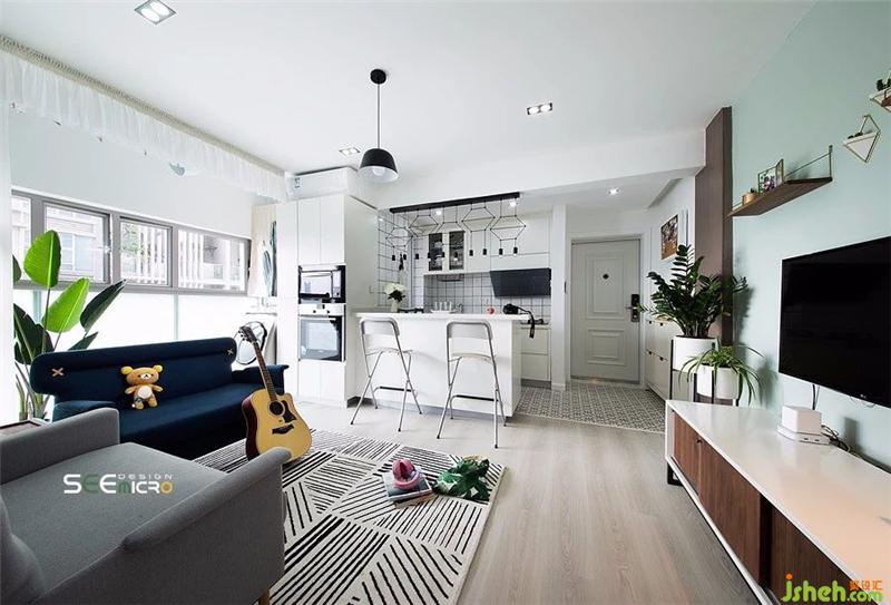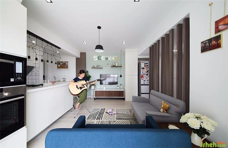 客厅三面墙体,打破三面,仅留其中一面作为电视背景墙,整个客厅瞬间变得“不像56㎡的房子能拥有的客厅”,通透舒适,就像——青春该有的样子。装修设计