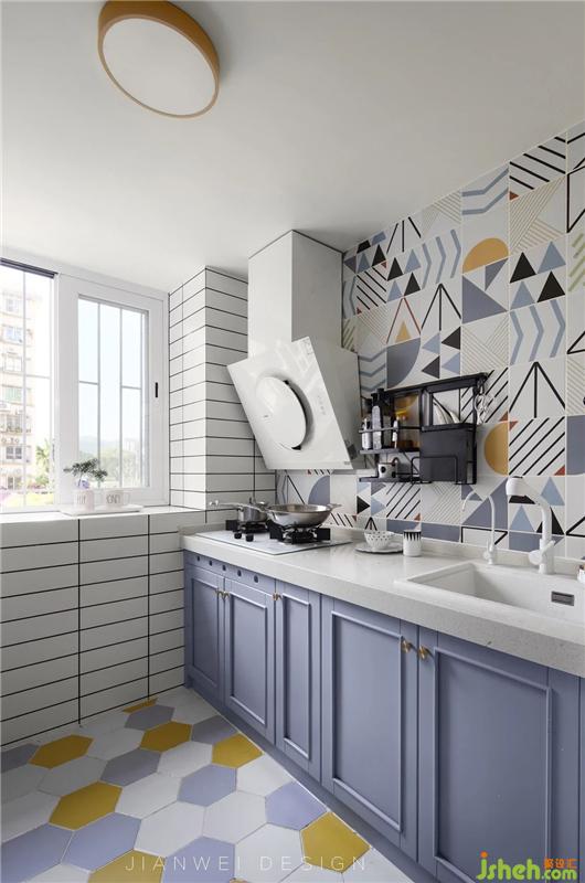 厨房空间不大,但功能齐全,蓝色橱柜搭配白色面包砖,视觉统一和谐,花砖的点缀格外精致,可以好好的享受每一次做饭的乐趣。
