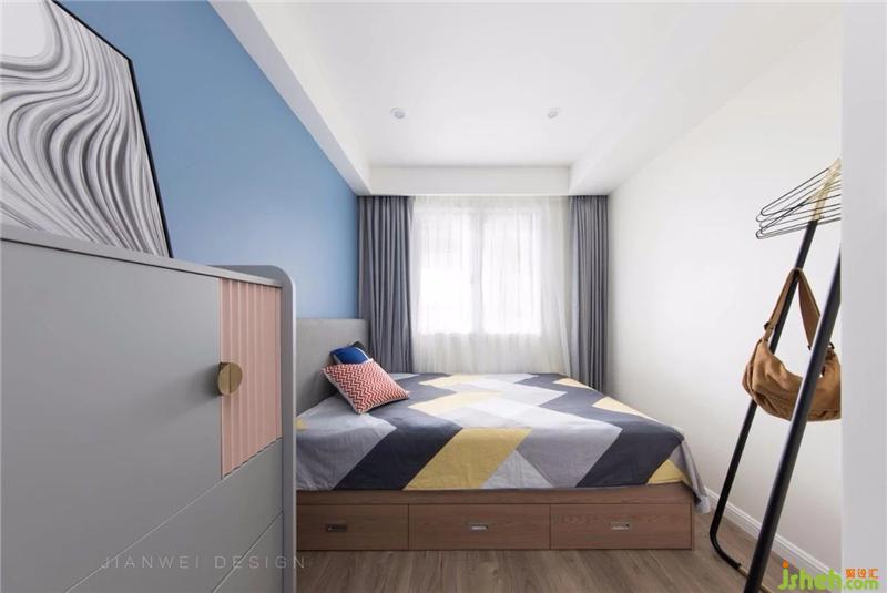 次卧延续主卧的色调。相互呼应,却又各自精彩。储物床满足小空间的储物需求。装修设计