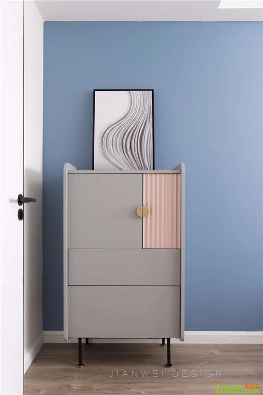 最为亮眼的个性斗柜,浅灰和烟粉的色彩搭配,温暖整个空间。装饰画上的柔和弧形,给空间带来了灵动的气息。