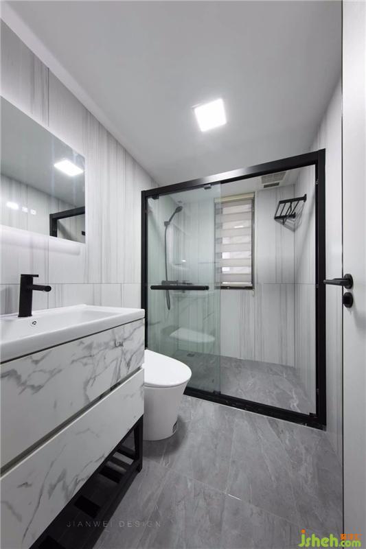 卫生间使用了大理石纹理元素,营造出极简、典雅的氛围。竖纹大尺寸墙面砖让卫浴空间更挺拔,智能镜柜和智能马桶给生活带来便利。装修设计