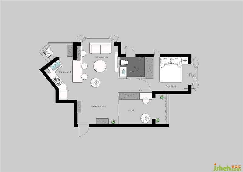 本案围绕“简”,是典型的现代简约风格,所采用黑白灰颜色,无疑给室内装饰艺术引入新意!在配置上,有质感的系列家具,独特的光泽使家具倍感时尚,具有舒适与美观并存的享受。黑色间配给人一种十分独特的醒目亮点。灰色是黑白的过渡色。肩负着和偕自然角色,把黑与白反差缓冲了。在配饰上,黑色用到恰到之处,使整个装饰搭配体现淋漓尽致。