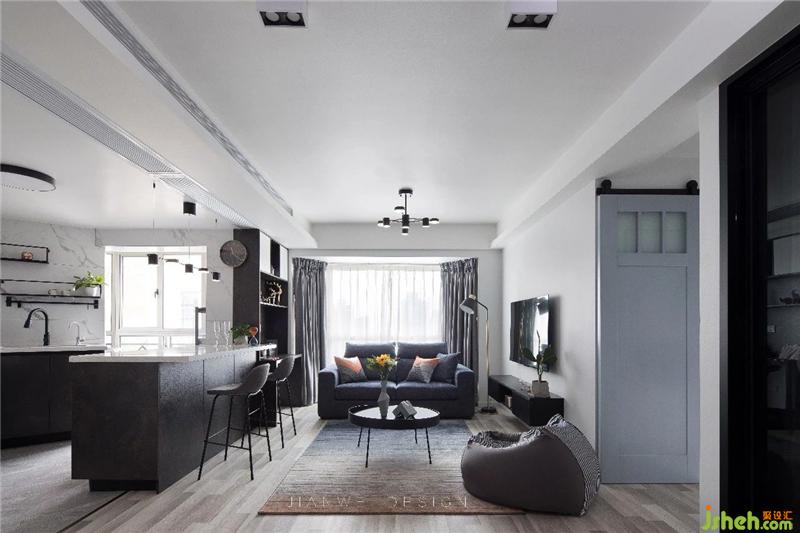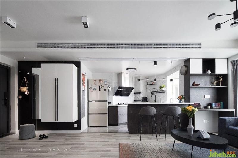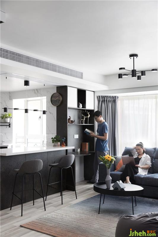 客厅与餐厅相连结,通透感极强,简洁明快,较其它装修空间要更明快光鲜。黑白间奏响着跳跃的音符,冷酷的宣告这是年轻时尚的领地。装修设计