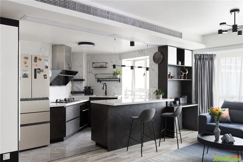 厨房做成了开放式,L型橱柜及大冰箱满足平时做饭的需求,超大1.8米吧台把餐桌、中岛,休闲、书桌的功能重叠在一起。分不同时间段满足不同的需求,可以是平时做饭的操作台,朋友聚餐的大餐桌,慵懒的2人下午茶时光,闲暇打游戏的网咖时刻。