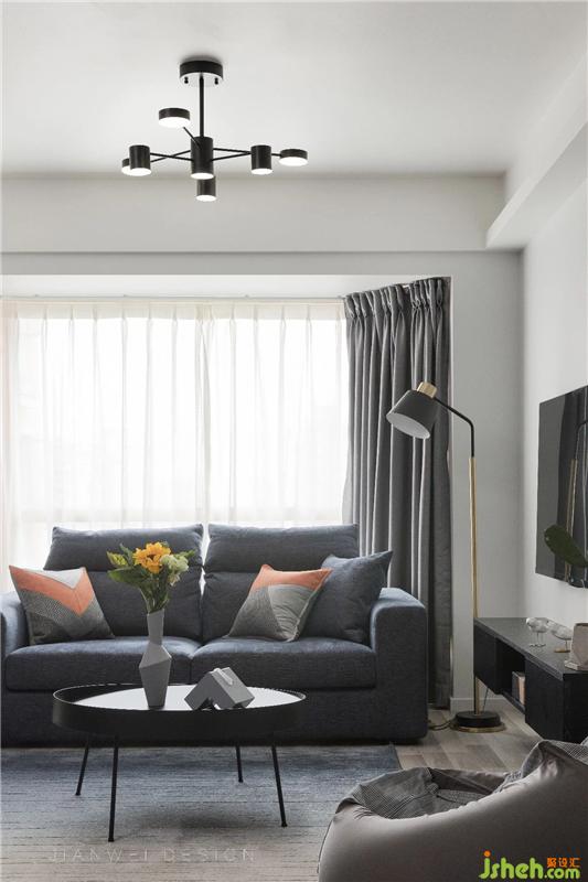 整个客厅以一种简约自然但不简单的生活理念,让人们远离喧嚣的生活带来的紧张与浮躁。色调统一,家具整体色调为灰色.素色的布艺沙发与整个空间和谐搭配。