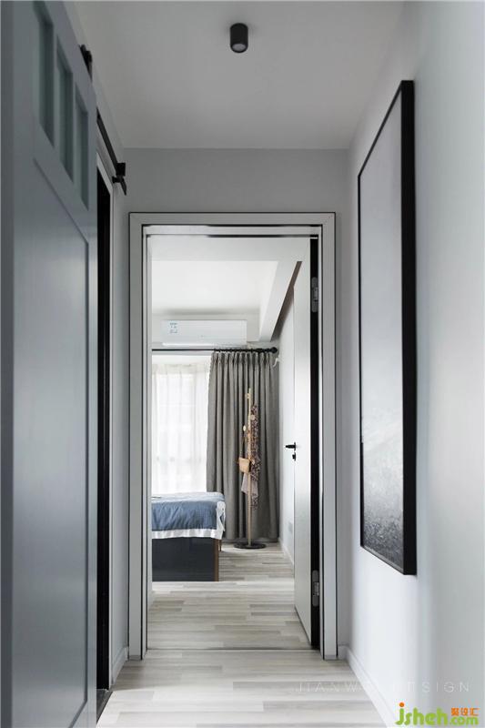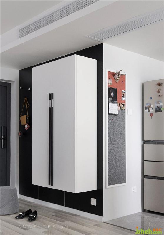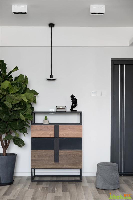 去掉多余的玄关处理,用最基本的表现手法来追求最深邃的部分。鞋柜做成悬浮式的造型鞋柜,满足收纳的同时让整面墙更有科技感。装修设计