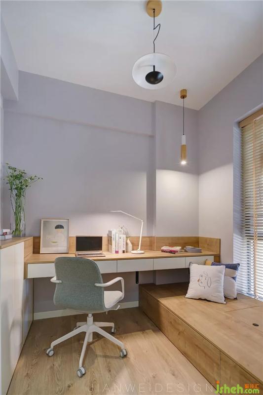 一心不可以二用,但是一室可以三用。这是一个集客房、储物为一体的书房。榻榻米上铺上一层软垫即可方便朋友留宿。桌上的台灯或上方的筒灯可营造书房的安静之感;若是工作场景,也无惧照明。