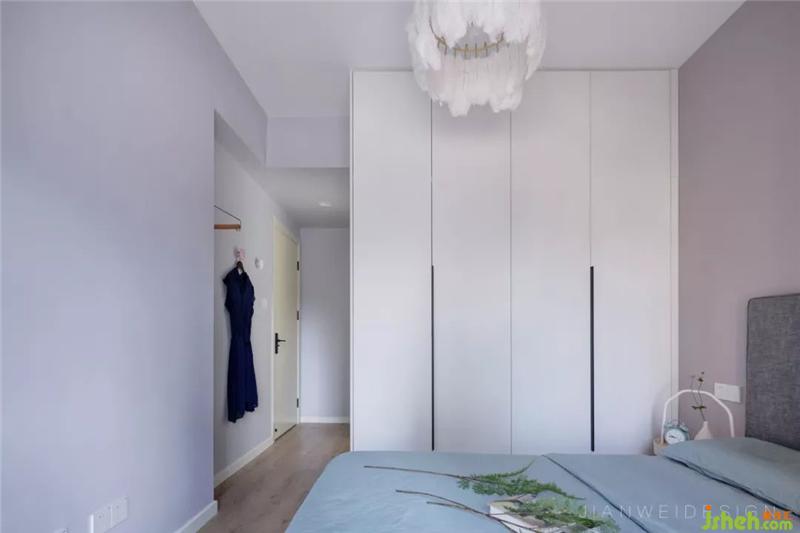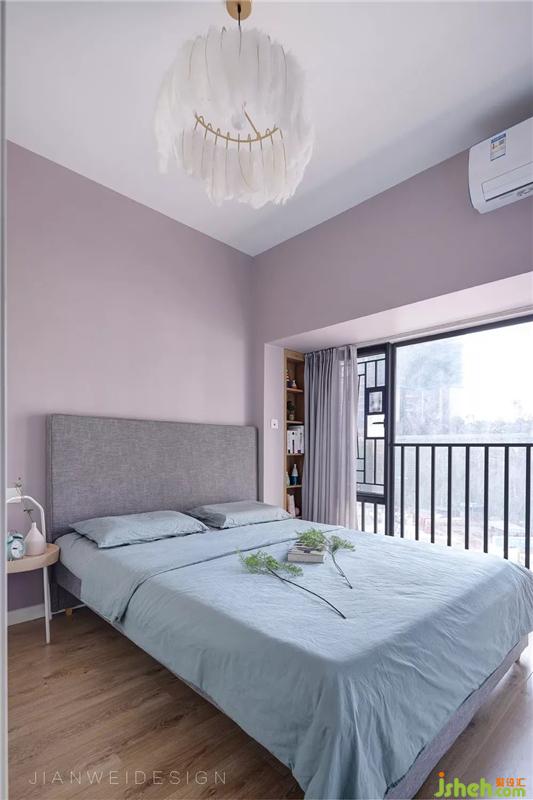 主卧灰和粉的相遇非常宁静柔和,黄铜+羽毛质感的吊灯柔化光线,温馨而柔软。装修设计