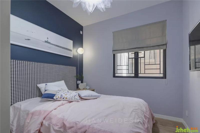 次卧以浅灰色和沉稳静谧的经典蓝搭配,空间加以柔光点缀,宁静而简洁。装修设计