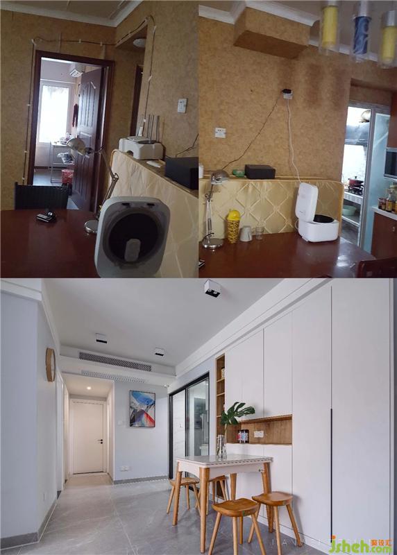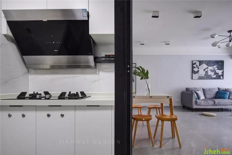 黑色的透明移门阻挡了厨房油烟进入客餐厅区域,也将光线更好得引入进了厨房,改造后的厨房已经没有了狭窄空间的压迫感。室内设计师