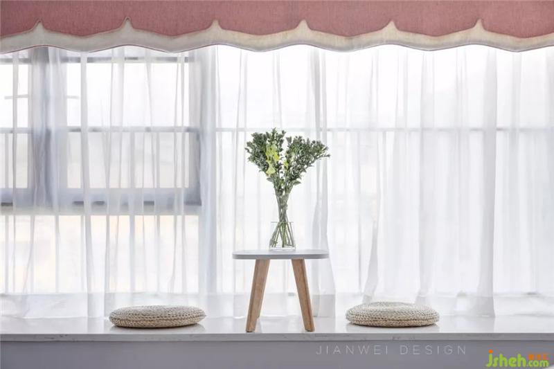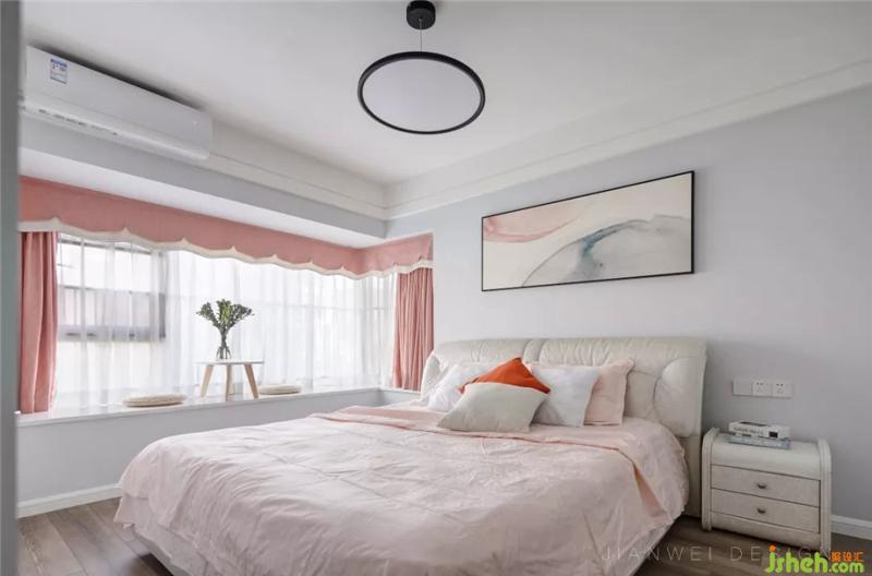 主卧延续了全屋的色调,并增加了淡粉色的比例,让空间更加柔软。软装的色调选择,无一不是为了让整个空间更柔和。室内设计师