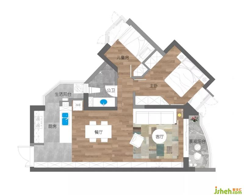 4.主卧收纳空间少,之字形的方式增大储物功能的同时也将功能区给隐藏起来,美化了视觉空间;