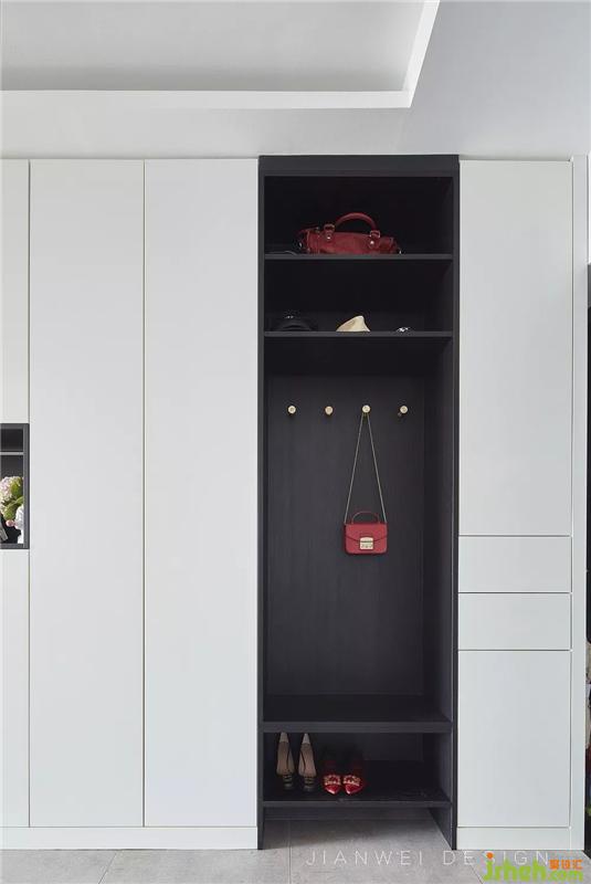三开门的通顶鞋柜满足了一家三口对鞋子的收纳需求。挂衣区,换鞋凳和常鞋位三个功能组合在一起,女主人的红包包给空间带来了锦上添花的效果。室内设计师