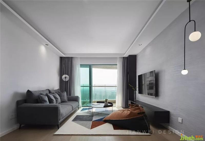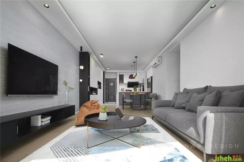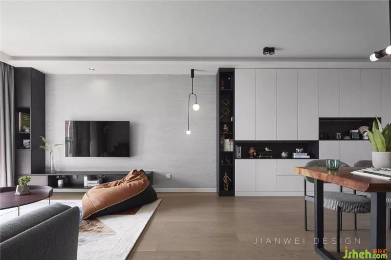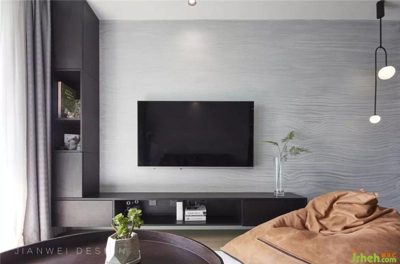 浅灰色的艺术漆面作为过渡中和了硬朗的黑色电视柜,几何线条吊灯提升空间的简约感。室内设计师