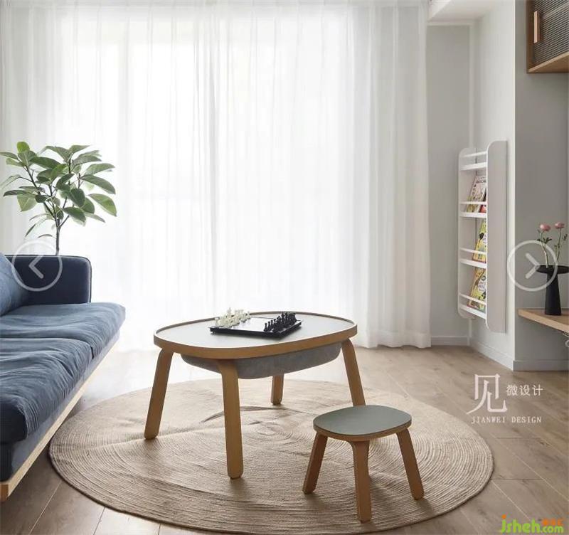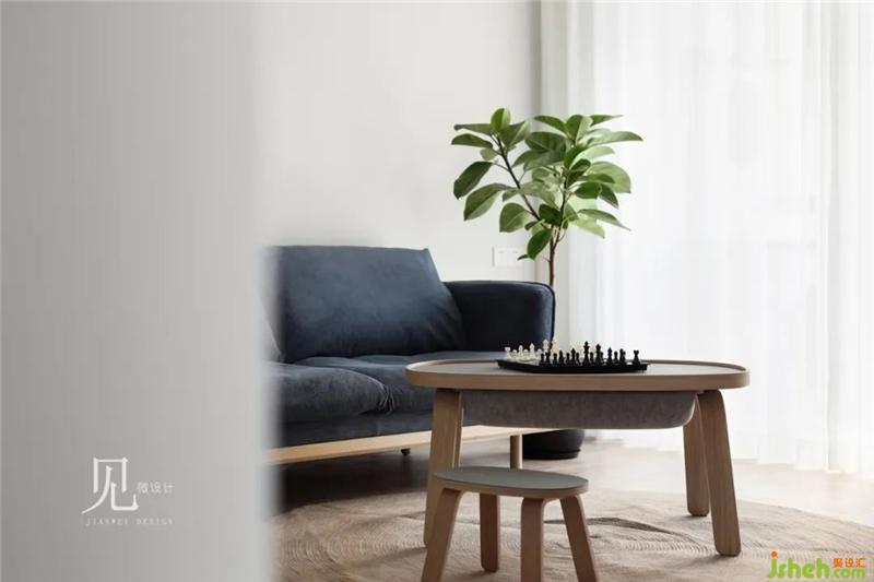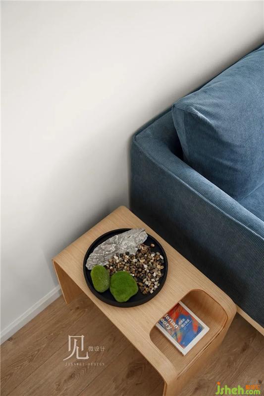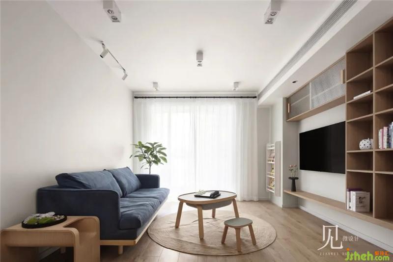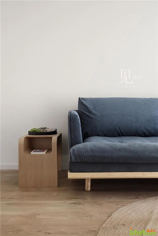 客厅整体色调以白色、原木色为主,加以低饱和度的灰蓝色进行点缀。室内设计师
