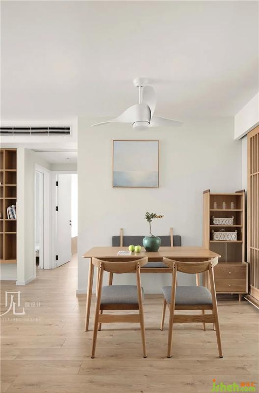 地台的设计 巧妙地将书房与餐厅进行隐形划分,障子门下方安装了隐藏式灯带,餐厅灯饰选用节能环保的风扇灯。