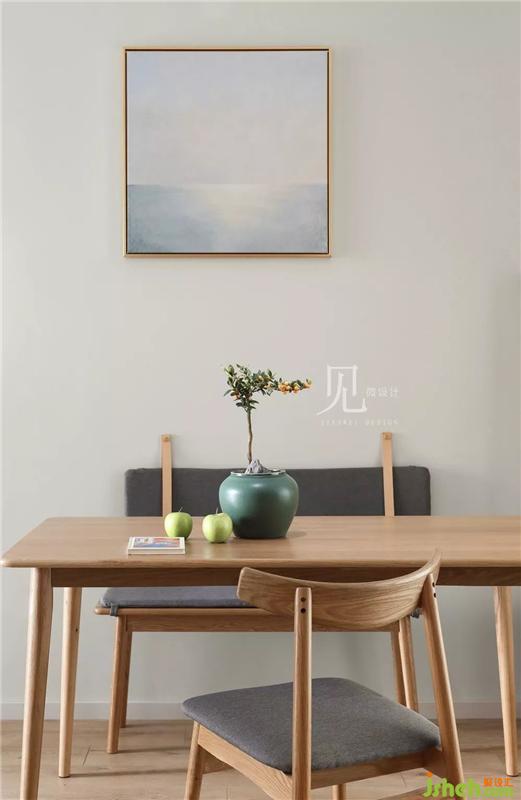 餐椅我们特意设计一边是木质靠背椅,另一边是日式长凳。
