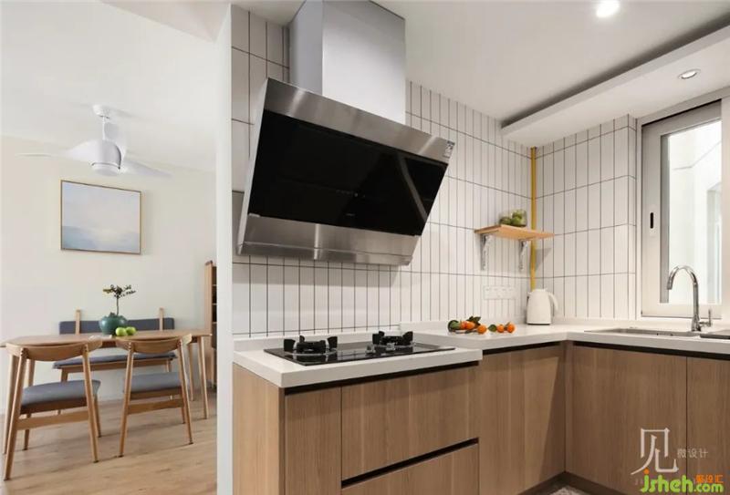 厨房依旧延续白色、原木色的搭配,与整体装修风格更加和谐统一,开放式厨房除了能显得空间更加通透,还能增添家人、朋友之间的互动。