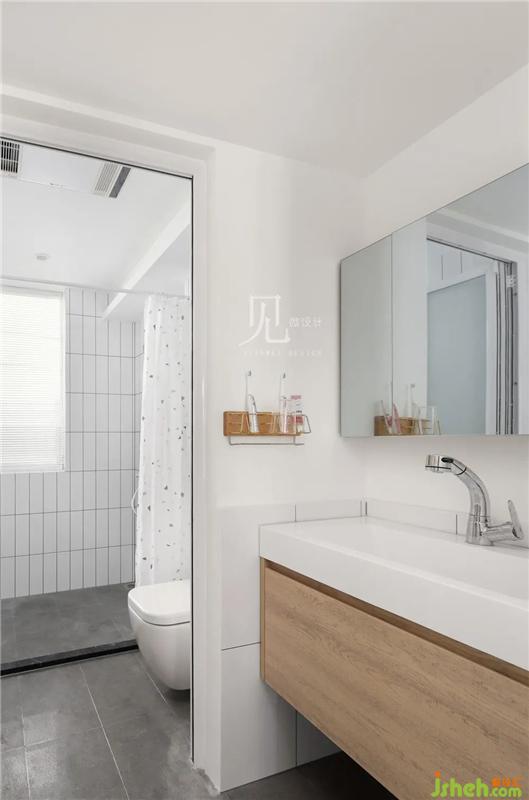 卫生间干湿分区,抽拉式龙头更方便清洁各种卫生死角,壁挂式牙刷架除了便于拿取也让台面更整洁。