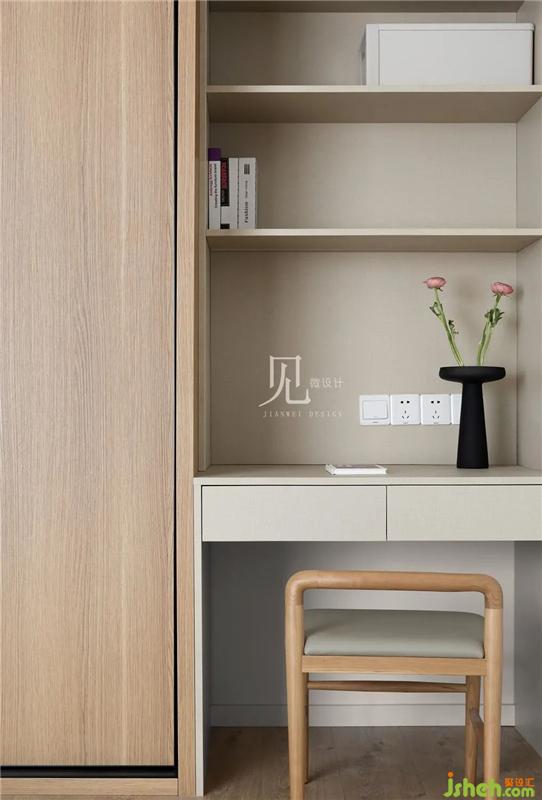 主卧设计了小型桌椅,即可当梳妆台也可满足日常办公需求。