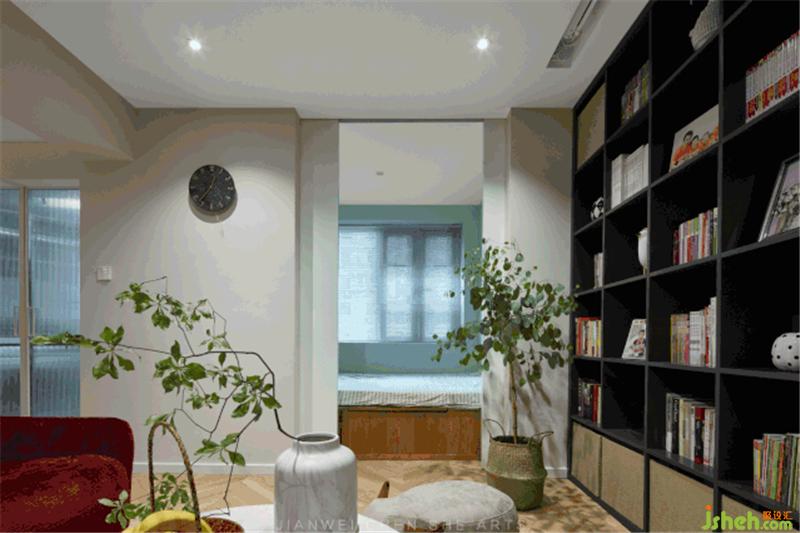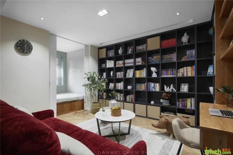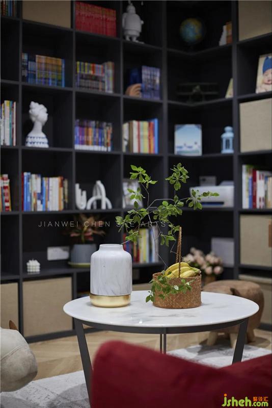 客厅想营造书屋读书角的氛围,大两整面的书柜,收藏量惊人,随手拿一本读物,便可幸福地沉浸于书的海洋。