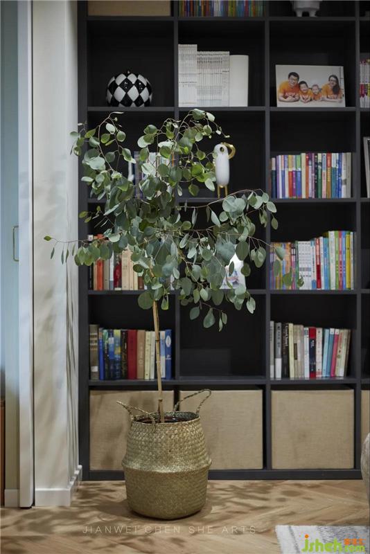 相较于房间内学习,这里场地为宽阔,尤加利树静置书柜一角,灯光下树影斑驳,是让孩子心情更加放松的一隅新天地。室内设计师