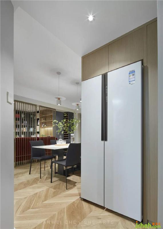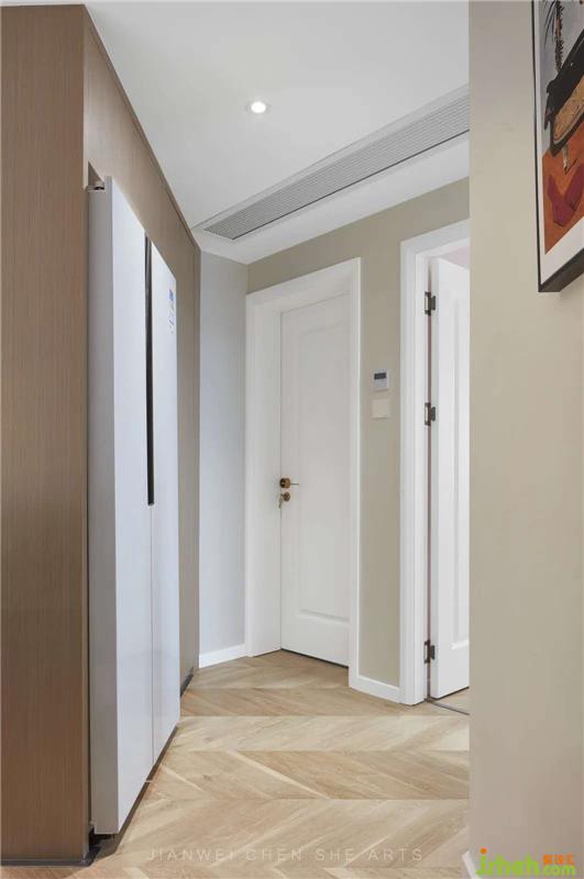 利用过道墙面打造了一个实用型的立柜,镶嵌式冰箱与立柜和整体的装修风格融为一体,美观的同时还节省了更多空间。室内设计师
