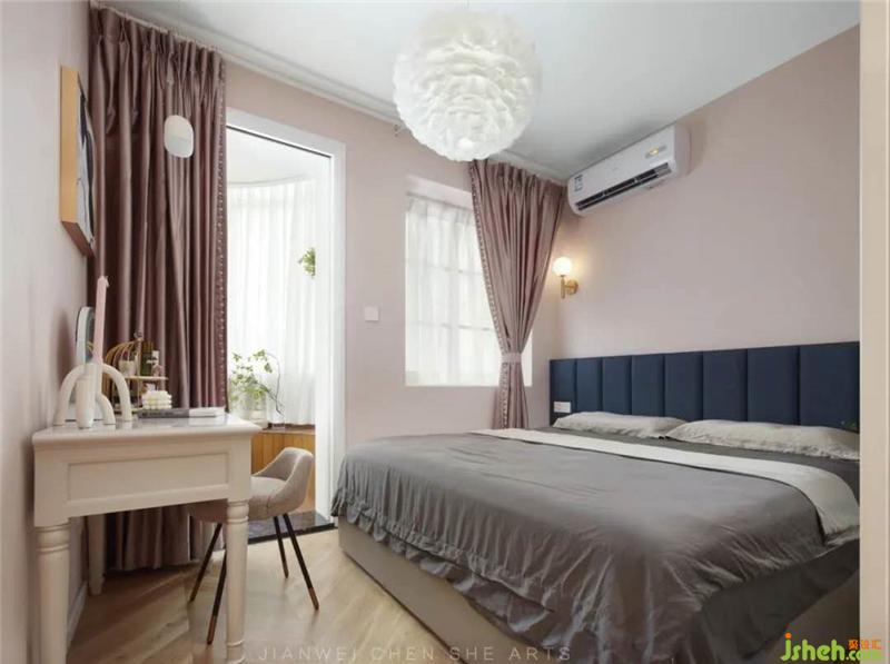 室内设计极简,粉色和蓝色搭配的清新色调看起来既温馨又不失浪漫,地面采用人字拼接实木,简约温润自然。内部增加了白色储藏柜,方便衣物的储藏收纳。