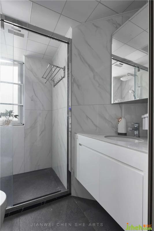 卫生间干湿分区,避免室内空气污浊,以之前不规整设计为契机,在合适的位置刚好留出了一个三角形空间,空间得以合理利用,三角形的洗漱台也更加有新意。