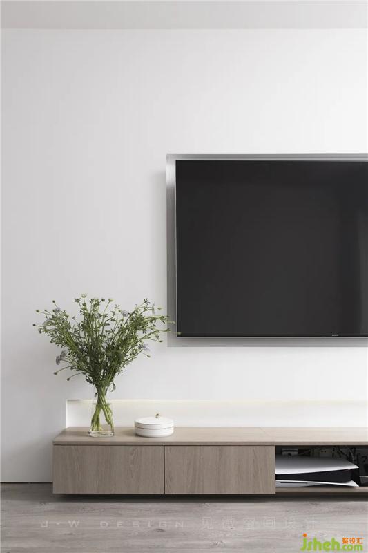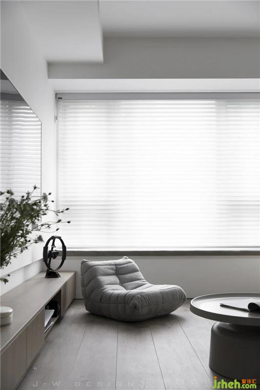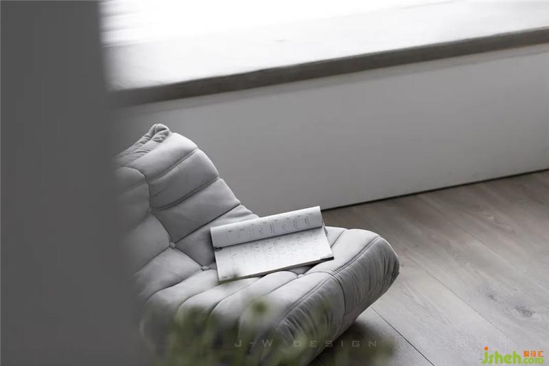 角落的阅读区,摆放着一把灰色布艺沙发、木质地板和墙面大面积的留白设计,显得格外通透静逸深圳室内设计。