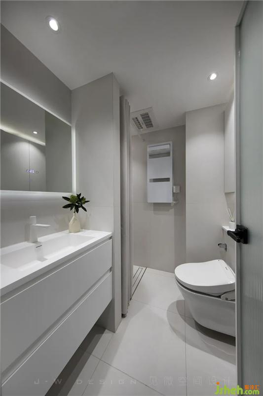 卫生间白色主调的风格与新型家电融合在一起,极简纯粹的设计并不影响现代科技的使用,能够提高生活质量。纯色哑光质感的瓷砖不仅好打理,而且提升空间质感。