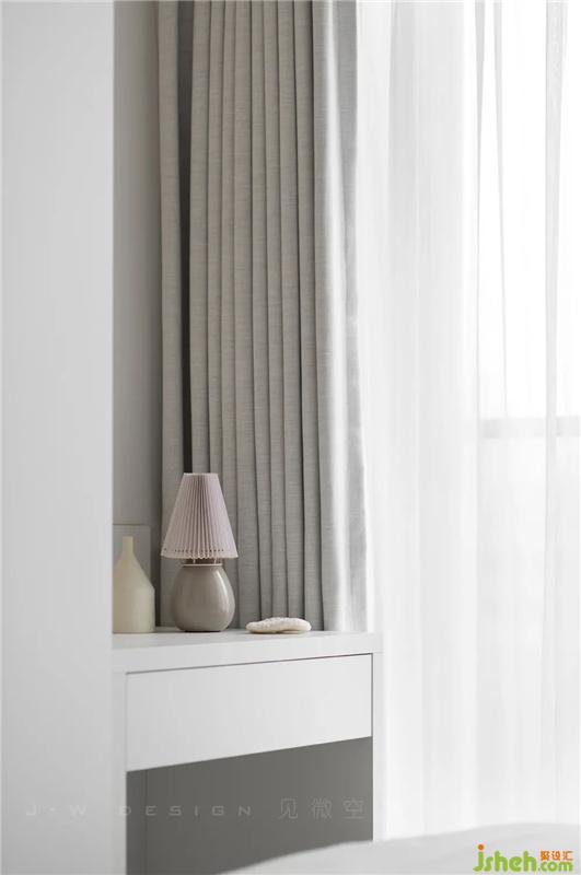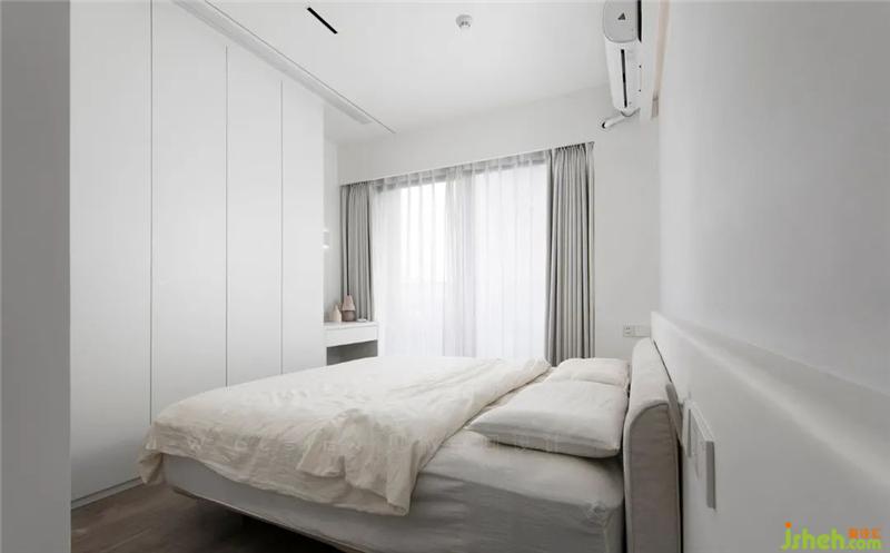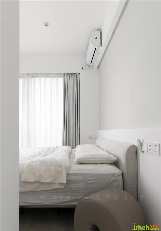 主卧延续了白色的主色调,窗帘及床品做了一个灰色层次处理,营造出了安静、精致的空间基调,与温润的木质地板呼应,达到舒适的平衡深圳室内设计。
