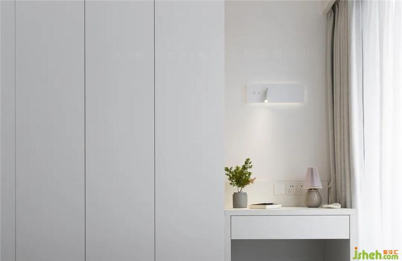 次卧主要考虑空间合理利用的问题,在保证舒适度的同时,提升实用性。衣柜做了两截门板的特殊处理,不仅解决了空间问题方便日常使用,还提高了收纳布局,在简洁的空间里增添层次。