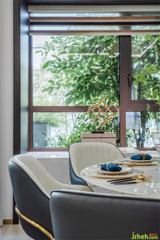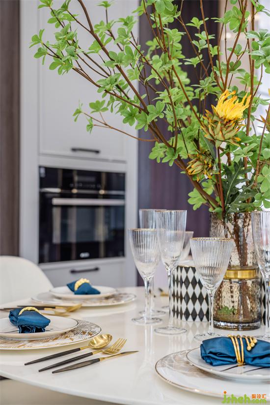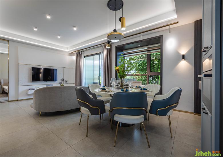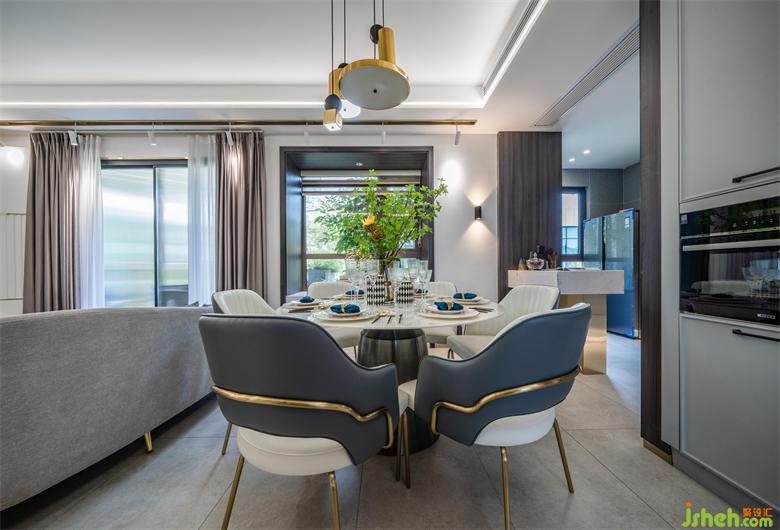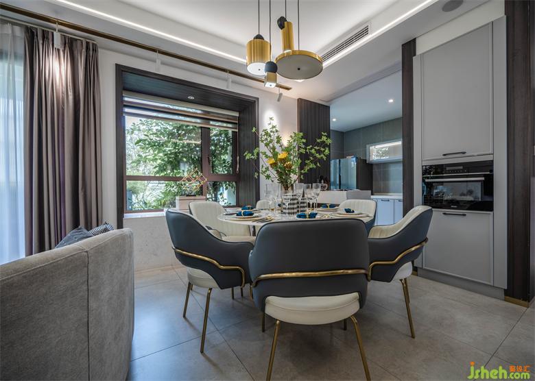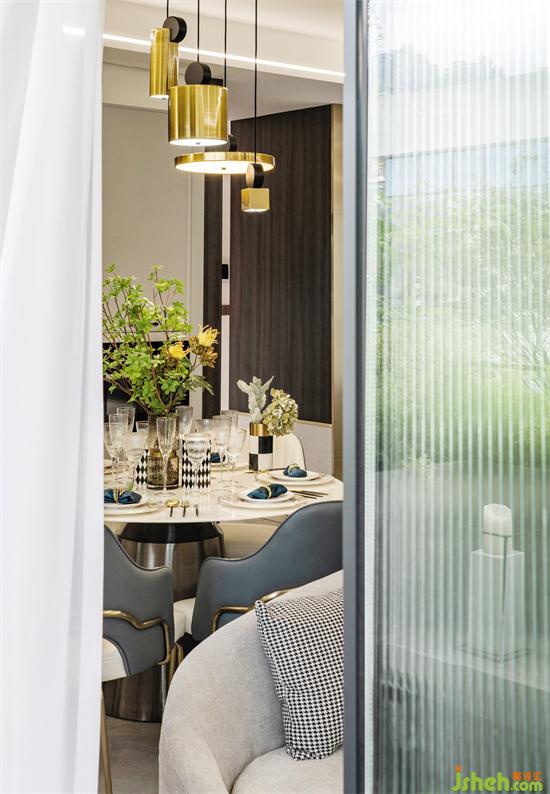 圆形餐桌、个性化装饰品是对仪式感的追求,每日三餐,一家人在美味四溢、欢声笑语的氛围中,被幸福包围。错落的吊灯立体感十足,家装设计交错光影下的美食让人食指大动。