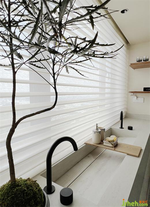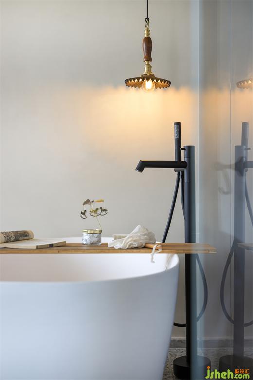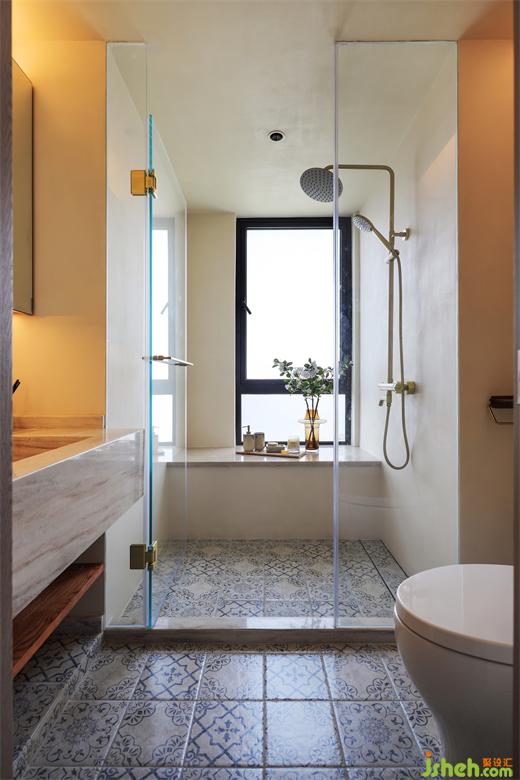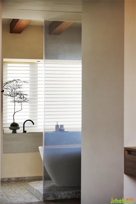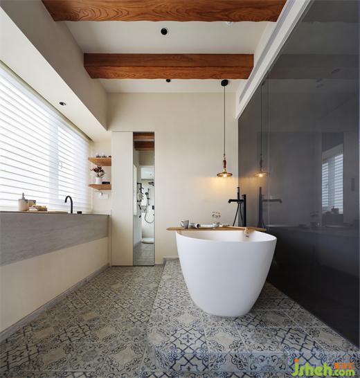 除此以外我自己最喜欢的是他们家这个卫生间了,牺牲掉一个卧室做的卫生间,亚运城天峯家装设计将舒适值做到最大化,摒弃传统砖墙,在和卧室的链接处我们是用了夹丝玻璃,减轻空间面积,同时把大面积的光线引进来,使主卧空间更加明亮通透,浴缸是屋主夫妇强烈要求一定要有的功能,为了解决浴缸的下水问题,我们在浴缸底部做了抬高,柔和的曲线和利落的线条相结合,也让这个区域生出一种仪式感来。因为主卫是并了一个小卧室进来的,所以它和原先的卫生间区域存在一个层高上的落差,装修公司迎合建筑本身裸露出来的梁位结构,我们设计了几条一样木饰面假梁,加深空间构成感。地面手绘的小花砖,台面质朴的洞石岩板,再加上天面的原木梁,整体呈现出别样的异域风情,在两扇窗景下看到的是得天独厚的江景,只需一抬眼便能将这幅斑斓清新的自然画卷尽收眼底,整体营造出在家即度假的体验感。
